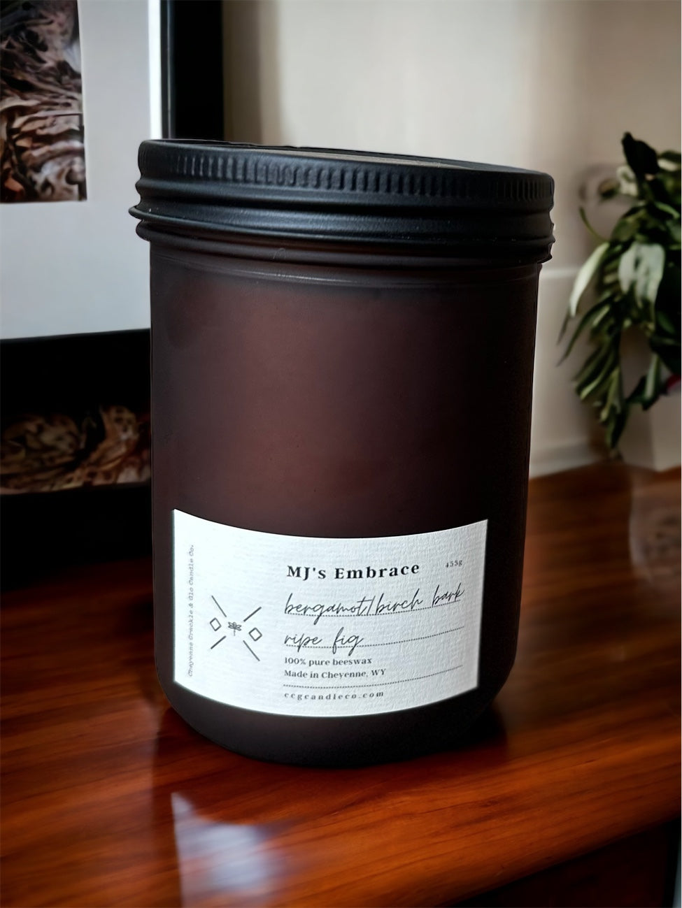 Mj's Embrace is a captivating combination of bergamot, birch bark, and ripe fig crafted to evoke the comfort and affection of my Grandad's hug. This candle provides a cozy atmosphere with the highest quality beeswax, crackling wicks, and clean burn. Surrender to this tranquil fragrance and leave feeling the solace and love of a cozy hug.