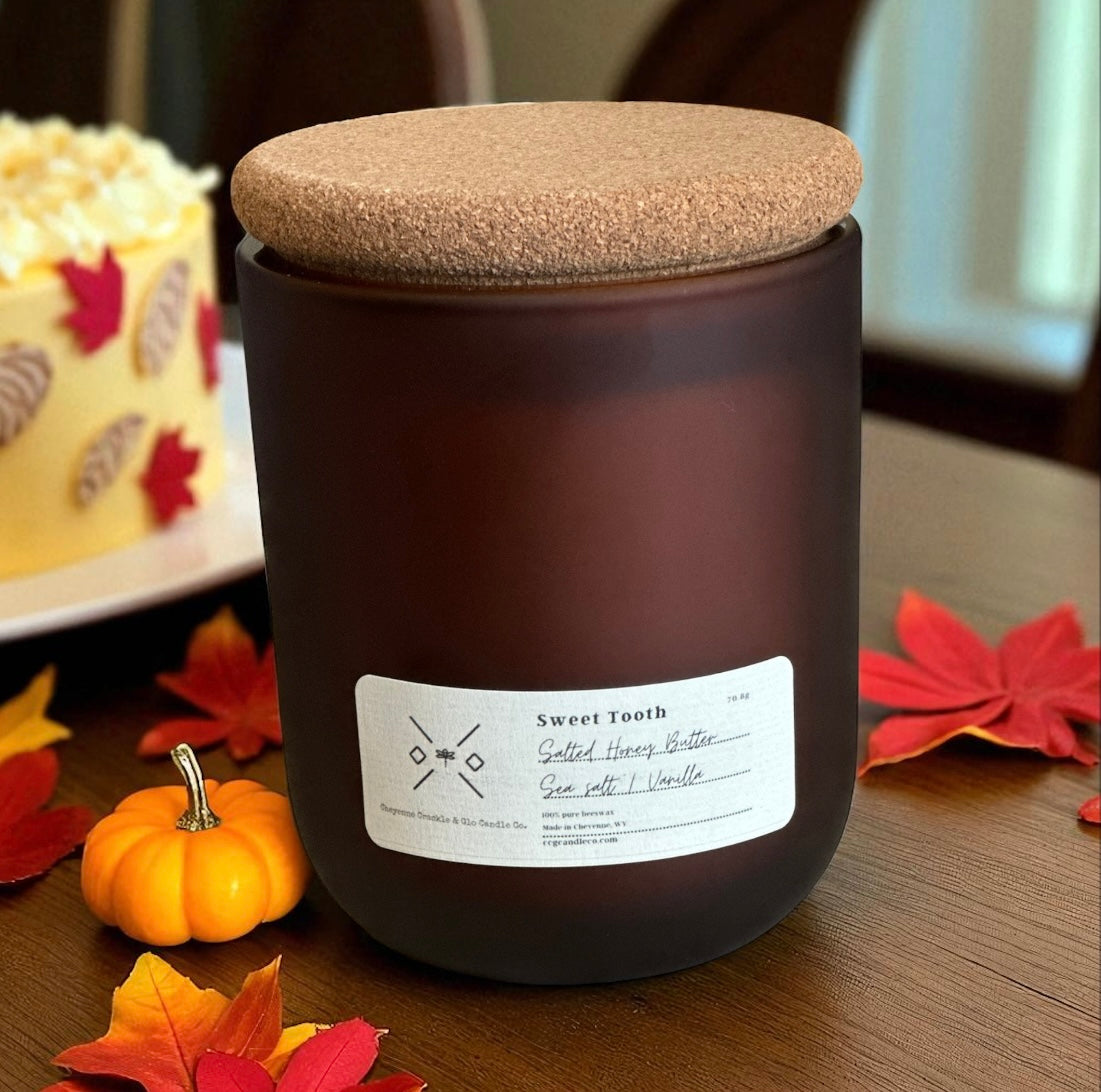 Treat your senses to "Sweet Tooth", Cheyenne Crackle & Glo Candle Co.’s newest holiday blend. Featuring a harmonious mix of salted honey butter, sea salt, and vanilla, this fragrance delivers a rich, sweet aroma that enchants without excess. Perfect for adding a warm, inviting ambiance, Sweet Tooth satisfies your cravings with a refined & balanced aroma.
