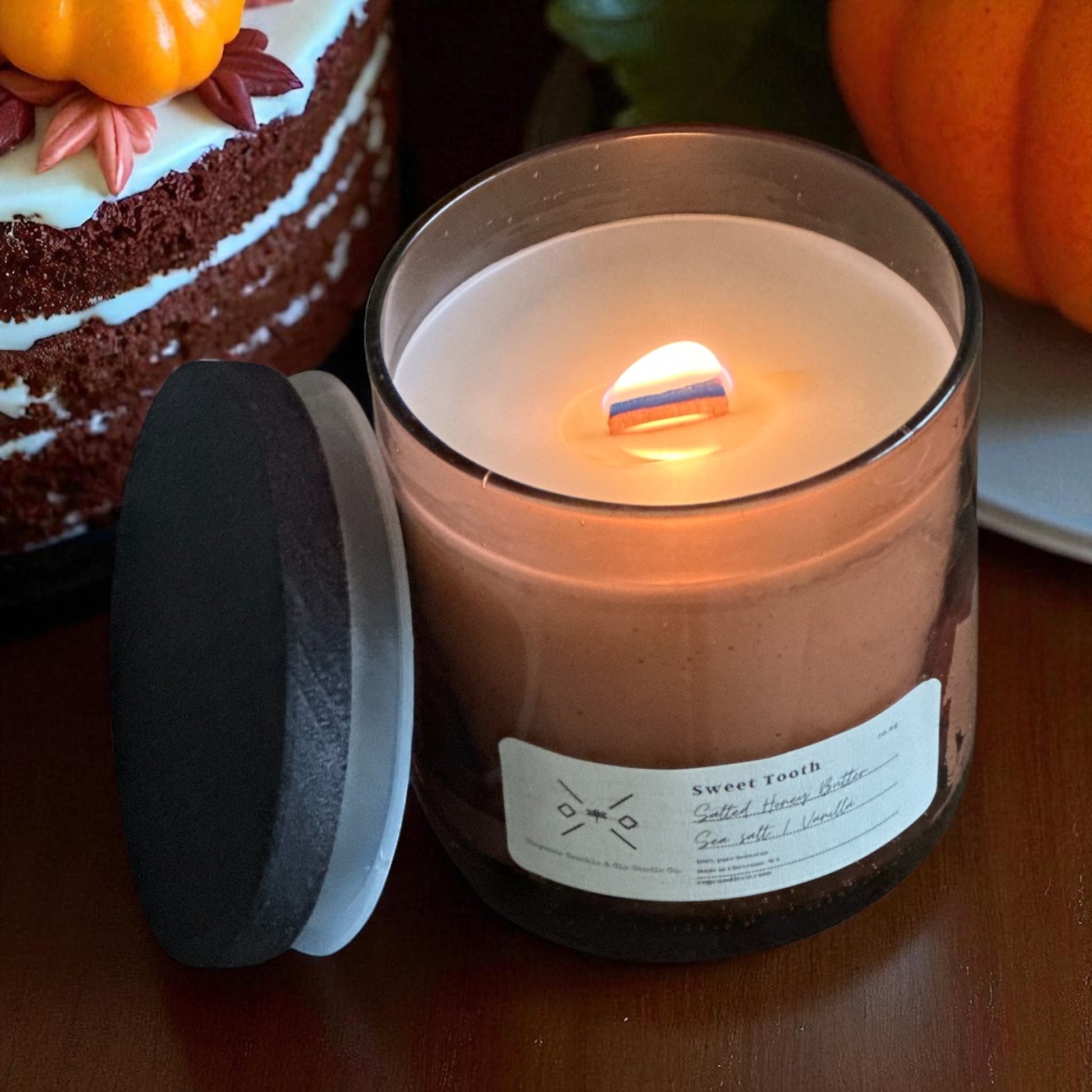 Treat your senses to "Sweet Tooth", Cheyenne Crackle & Glo Candle Co.’s newest holiday blend. Featuring a harmonious mix of salted honey butter, sea salt, and vanilla, this fragrance delivers a rich, sweet aroma that enchants without excess. Perfect for adding a warm, inviting ambiance, Sweet Tooth satisfies your cravings with a refined & balanced aroma.